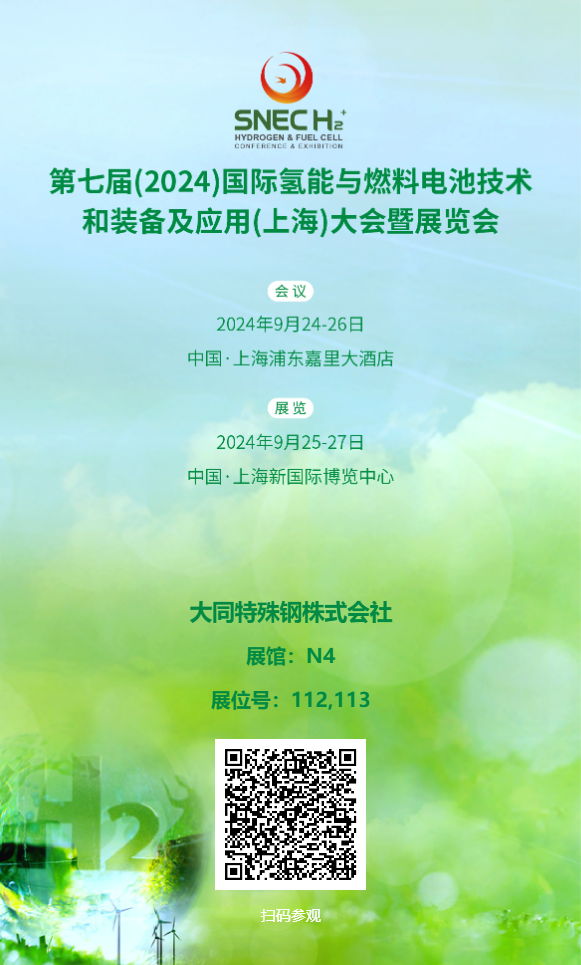 SNEC-H2第七屆(2024)國際氫能與燃料電池技術和裝備及應用(上海)大會暨展覽會,將于2024年9月25日至27日在上海新國際博覽中心(上海?浦東)舉行。大同特殊鋼(上海)有限公司作為大同特殊鋼的代表,將出展此次展覽會。